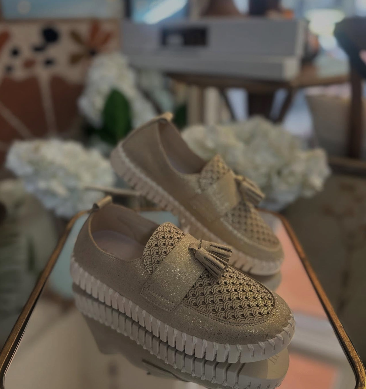 Elevate your footwear collection with the Ilse Jacobsen Tulip Tassel Loafers. Featuring a sophisticated metallic gold finish and stylish tassel detail, these slip-on loafers combine effortless elegance with practicality. Crafted from recycled microfiber, they offer eco-conscious comfort, while the removable footbed ensures customizable support for all-day wear. Ideal for those seeking a blend of sustainable design and refined style.
