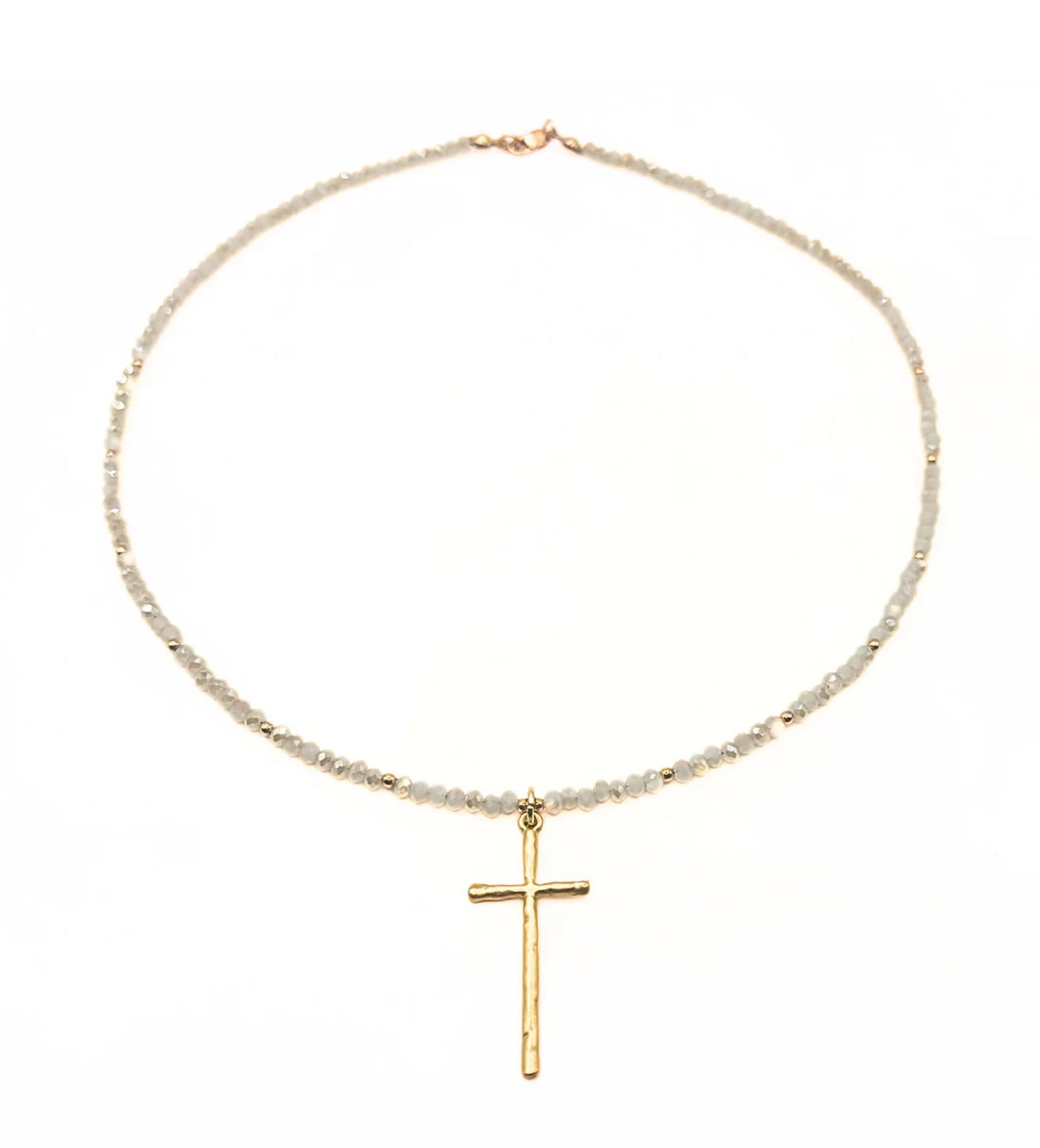 Our beloved prayer cross necklace has been refreshed with delicate crystal beads and 2mm gold-filled beads. They feature an Italian gold-filled clasp and are 16 inches in length.