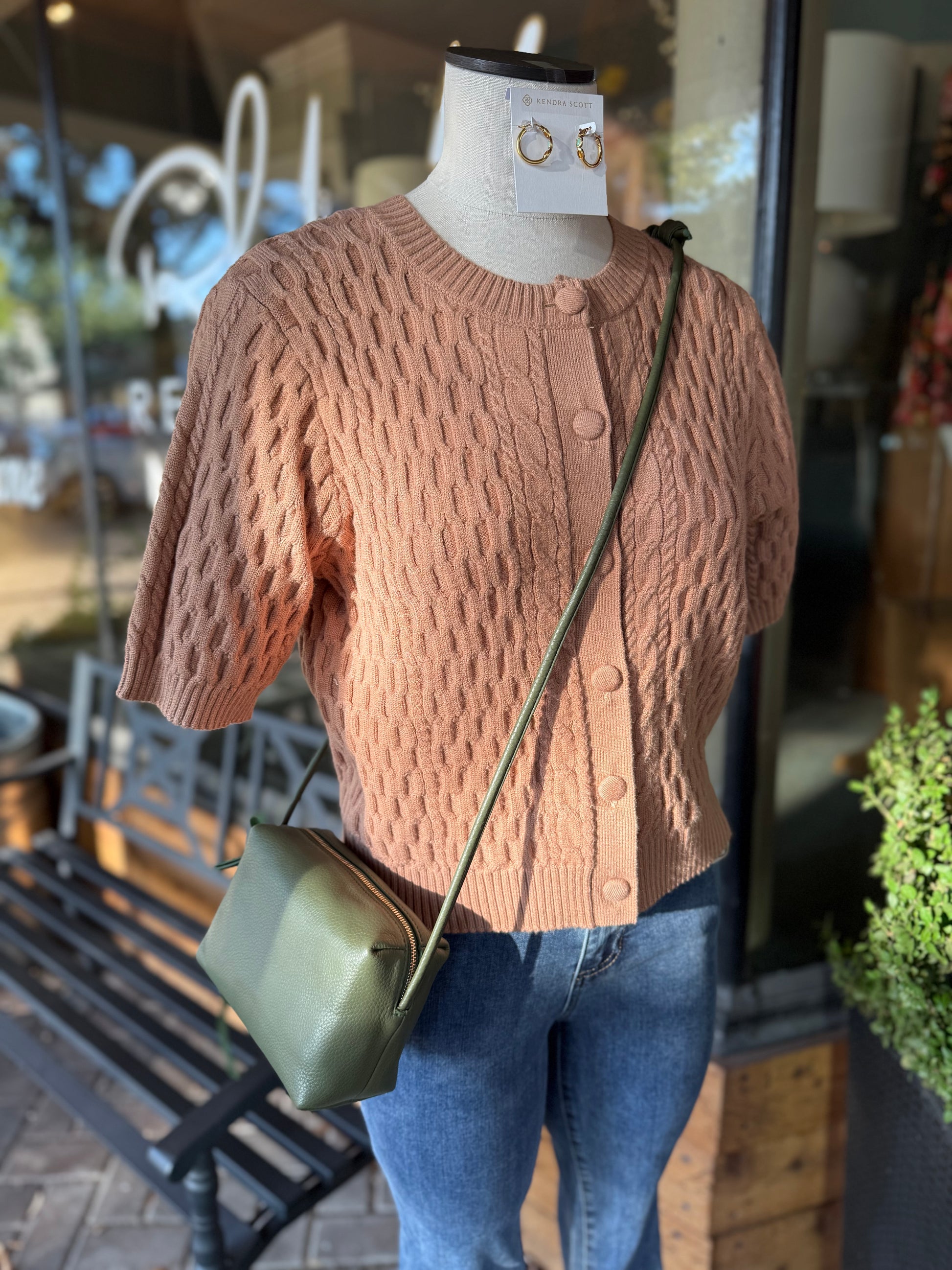 This short sleeve knit cardigan features a classic cable knit pattern with a button-front closure for easy wear. The ribbed trim adds structure and a refined finish, making it a versatile layering piece for any wardrobe. Designed for comfort and style, it pairs effortlessly with both casual and polished outfits.