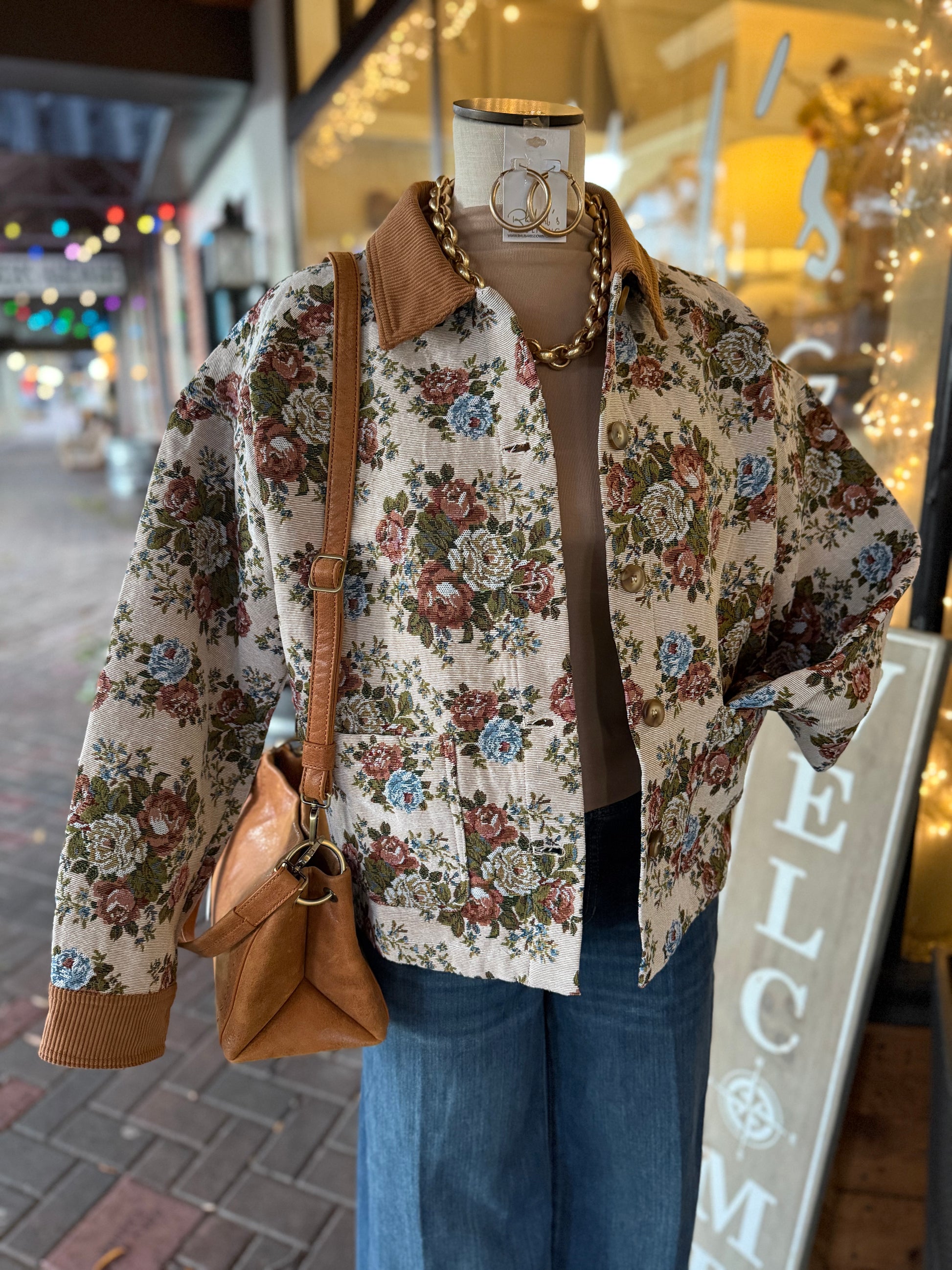This vintage-inspired floral jacket seamlessly blends rustic charm with timeless style. Featuring a classic button-front closure and authentic corduroy trim detailing, it captures the essence of barn-style fashion with refined sophistication. Practical front patch pockets add functionality without compromising the design's elegant aesthetic. The tapestry floral pattern brings warmth and character to any wardrobe, making it an ideal layering piece for those who appreciate curated, heritage-influenced pieces.